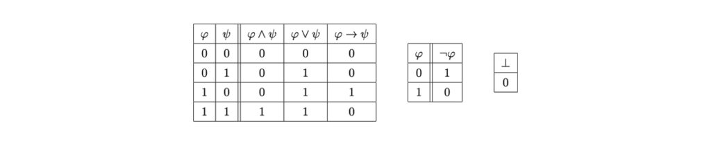 まず,普通の論理の意味論において論理結合子は以下のような真理値関数\(\{0,1\}^n\to\{0,1\}\)に解釈されます.