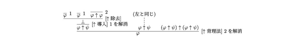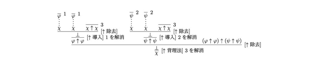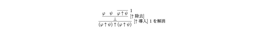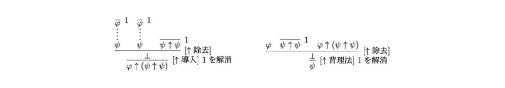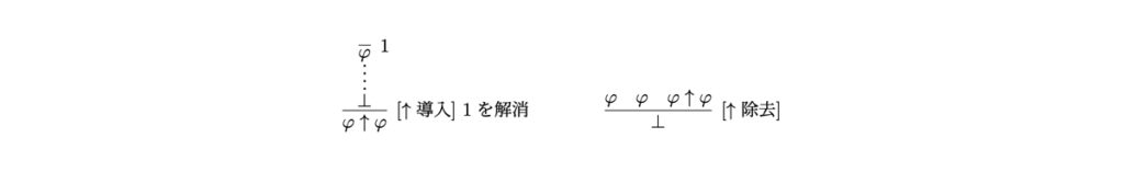 - \(\varphi\uparrow\psi\ \equiv \ \neg(\varphi\wedge\psi)\)とするとき\(\lbrack\uparrow\mbox{導入}\rbrack\)と\(\lbrack\uparrow\mbox{除去}\rbrack\)は派生規則である