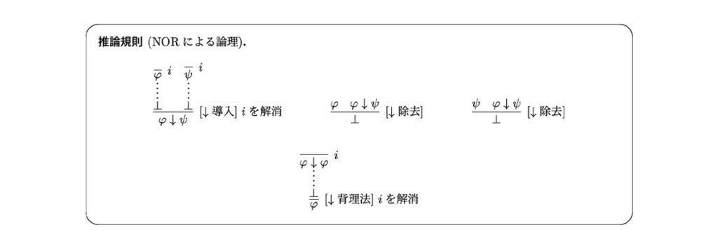 次にNORによる証明論を展開します. この節では論理式は命題記号と\(\downarrow\)のみを用いて定義されたものとします. \(\downarrow\)に対する推論規則を以下のように与えます.