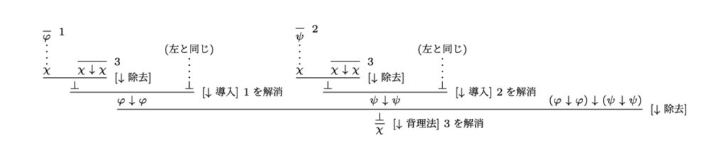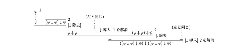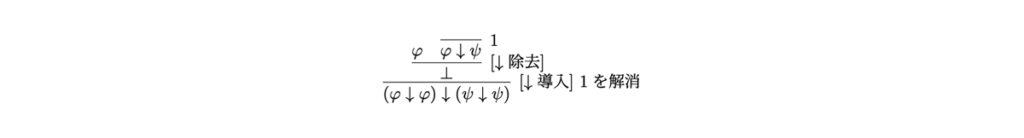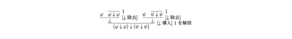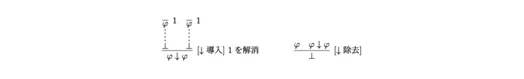 - \(\varphi\downarrow\psi\ \equiv \ \neg(\varphi\vee\psi)\)とするとき\(\lbrack\downarrow\mbox{導入}\rbrack\)と\(\lbrack\downarrow\mbox{除去}\rbrack\)は派生規則である