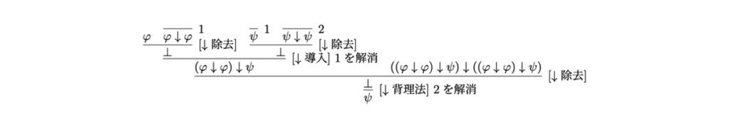 \end{align*}\] するとNORによる論理の推論規則\(\lbrack\downarrow\mbox{背理法}\rbrack\)は普通の論理の推論規則\(\lbrack\mbox{背理法}\rbrack\)になっていることがわかります. また普通の論理の推論規則\(\lbrack\neg\mbox{導入}\rbrack\)と\(\lbrack\neg\mbox{除去}\rbrack\)は次のように示せます.