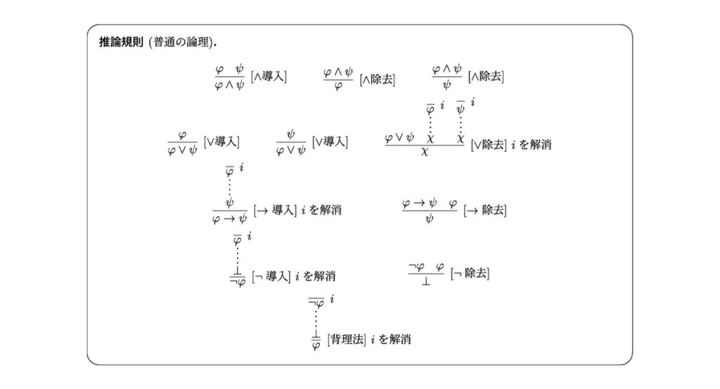 \end{align*}\] すると普通の論理の推論規則\(\lbrack\to\mbox{導入}\rbrack\)と\(\lbrack\to\mbox{除去}\rbrack\)は次のように示せます.