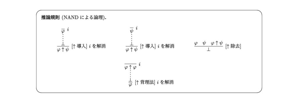 \end{align*}\] するとNANDによる論理の推論規則\(\lbrack\uparrow\mbox{背理法}\rbrack\)は普通の論理の推論規則\(\lbrack\mbox{背理法}\rbrack\)になっていることがわかります. また普通の論理の推論規則\(\lbrack\neg\mbox{導入}\rbrack\)と\(\lbrack\neg\mbox{除去}\rbrack\)は次のように示せます.